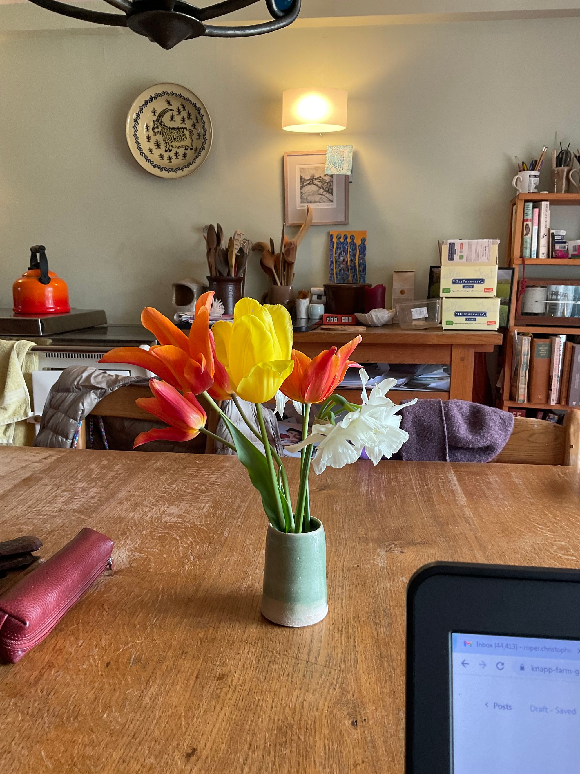 Finally, a word on tulips, we have never been keen on your standard municipal tulip, but there are many varieties that deserve a place in any garden. Some were blown over and we brought them into the house, where Ballerina is giving us great pleasure on the kitchen table, beside the multi-headed narcissus Thalia. We neither of us recognise the yellow tulip. More tulip reports will follow. I particularly like T.Clusiana, with candy-striped flowers.