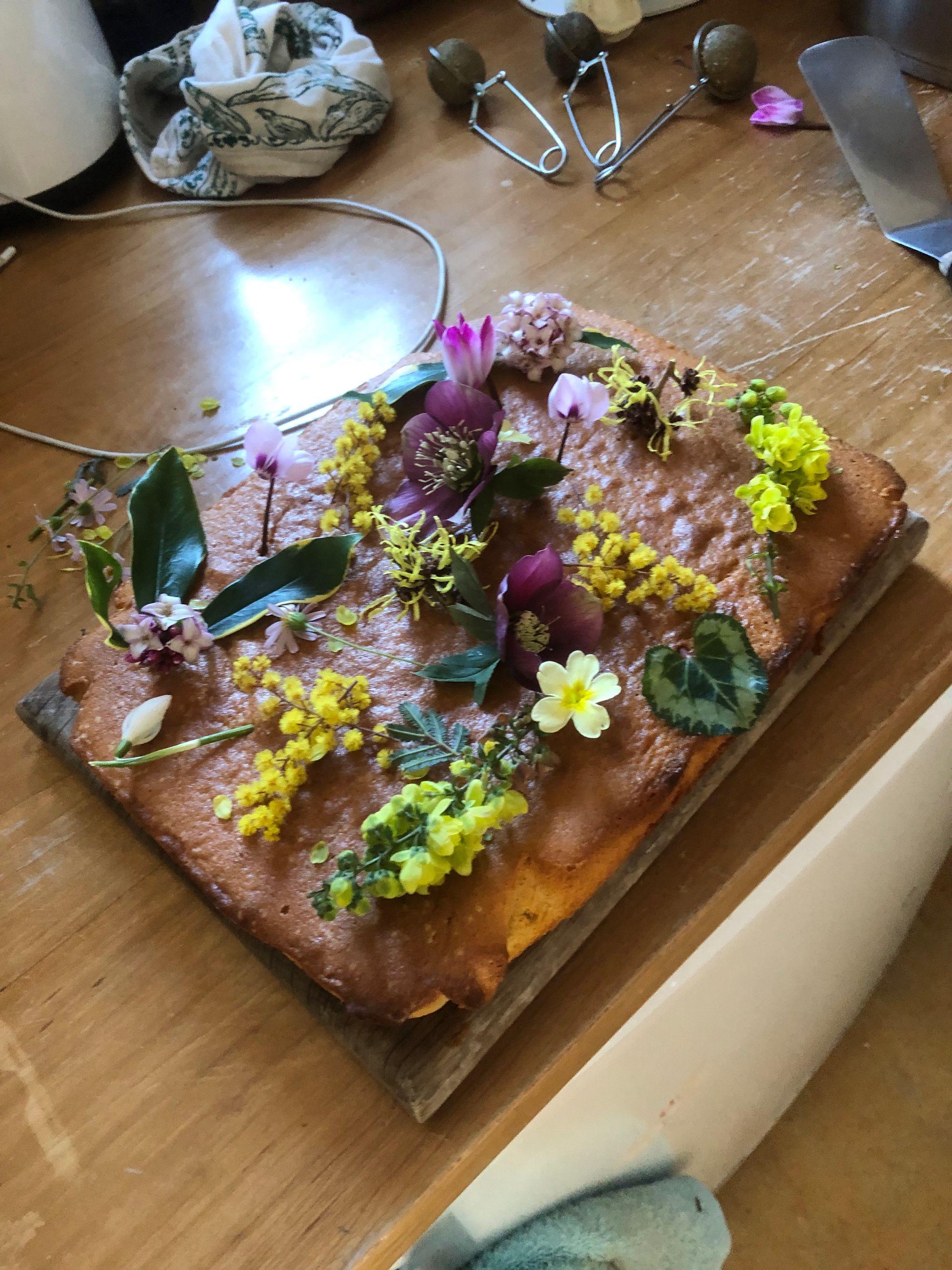 The great excitement of the end of January and early February is that Spring is in the air and every day sees new shoots poking through the grass. A brief walk around the house and crocuses have now joined the snowdrops. We planted 250 wild daffodils (Pseudonarcissus Lobularis) in the autumn and they are just poking their leaves through the grass. They grow freely in nearby meadows and in sheltered spots are already in bud. I expect ours will be late as we didn't get them into the ground until mid October. Janie created this cake for two friends' birthdays on 30th of January and it provides a good sample of what was flowering in the garden at the time.